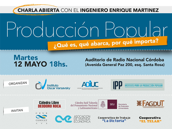 El martes 12 de mayo, en el auditorio de Radio Nacional Córdoba, el ingeniero Enrique Mario Martínez, ex presidente del INTI y coordinador del Instituto para la Producción Popular (IPP), expondrá sobre la necesidad y las ventajas de enfocar la economía nacional desde la perspectiva de la Producción Popular, que involucra a millones de trabajadores ubicados en los extremos más explotados de las cadenas de producción.