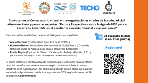AVE-CEVE-CONICET, Habitat International Coalition-America Latina (HIC-AL), Ciudad Sostenible 2030, TECHO Internacional y Social Watch presentan el conversatorio virtual ‘Retos y Perspectivas sobre la Agenda 2030 para el Desarrollo Sostenible en el desafiante contexto mundial y regional actual’.