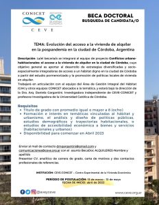 El Centro Experimental de la Vivienda Económica busca candidatas/os para postular a una beca doctoral del Consejo Nacional de Investigaciones Científicas y Técnicas (CONICET). La persona seleccionada se integrará al proyecto “Conflictos urbano-habitacionales: el acceso a la vivienda de alquiler en la ciudad de Córdoba”.