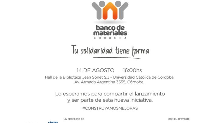 La Asociación de Vivienda Económica, la Universidad Católica de Córdoba y Caritas invitan al acto de lanzamiento del Banco de Materiales de Córdoba que se llevará a cabo el martes 14 de agosto en la Biblioteca Jean Sonet del campus de la UCC, sita en Av. Armada Argentina 3555.